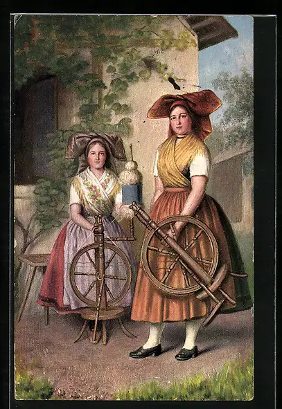 AK Zwei junge Frauen in Tracht mit Spinnrädern