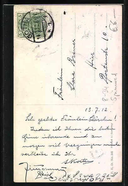 alte Ansichtskarte, gelaufen 1912, Eckknicke li., guter Zustand