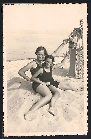 AK Zwei junge Mädchen in Bademode im Sand sitzend