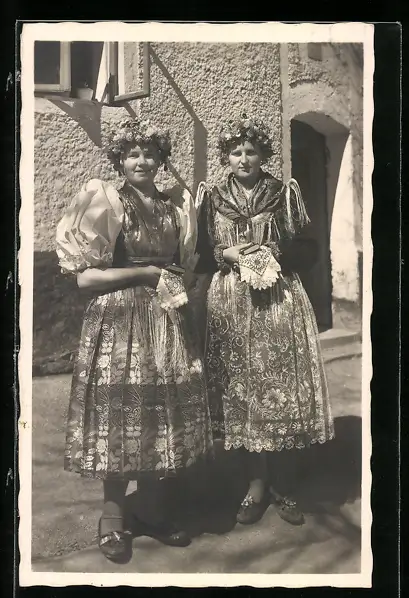 AK Zwei junge Mädchen in böhmischer Tracht vor einem Gebäude