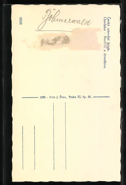 Personenbezogene Daten auf der Rückseite der Karte wurden durch blauen Textmarker unkenntlich gemacht. Die blauen Stellen sind auf die Vorderseite durchgeweicht und wirken sich negativ auf das Postkartenfoto aus