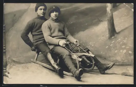 AK Zwei junge Männer auf einem Rodelschlitten