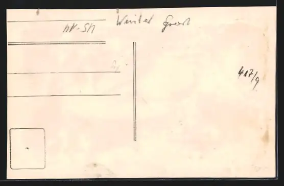 Personenbezogene Daten auf der Rückseite der Karte wurden durch blauen Textmarker unkenntlich gemacht. Die blauen Stellen sind auf die Vorderseite durchgeweicht und wirken sich negativ auf das Postkartenfoto aus