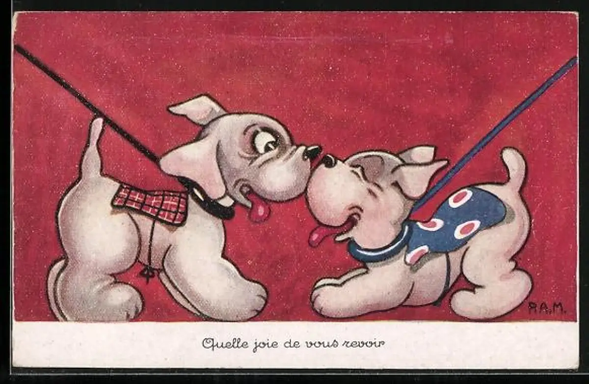 AK Zwei kleine Hunde beschnuppern sich fröhlich beim Gassigang