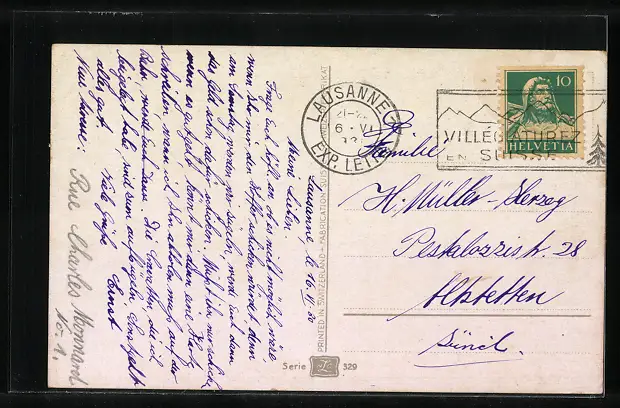 Personenbezogene Daten auf der Rückseite der Karte wurden durch blauen Textmarker unkenntlich gemacht. Die blauen Stellen sind auf die Vorderseite durchgeweicht und wirken sich negativ auf das Postkartenfoto aus