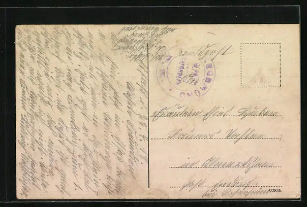 Personenbezogene Daten auf der Rückseite der Karte wurden durch blauen Textmarker unkenntlich gemacht. Die blauen Stellen sind auf die Vorderseite durchgeweicht und wirken sich negativ auf das Postkartenfoto aus