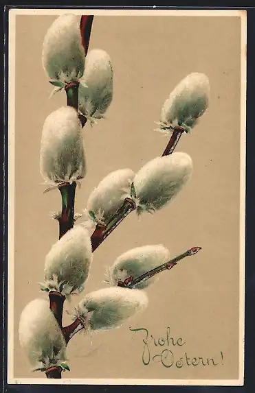 AK Zweig mit weissen Weidenkätzchen, Ostergruss