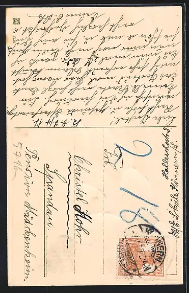 Personenbezogene Daten auf der Rückseite der Karte wurden durch blauen Textmarker unkenntlich gemacht. Die blauen Stellen sind auf die Vorderseite durchgeweicht und wirken sich negativ auf das Postkartenfoto aus