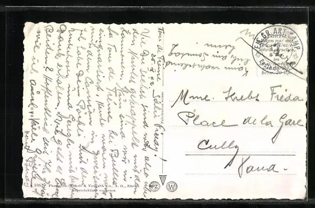 Personenbezogene Daten auf der Rückseite der Karte wurden durch blauen Textmarker unkenntlich gemacht. Die blauen Stellen sind auf die Vorderseite durchgeweicht und wirken sich negativ auf das Postkartenfoto aus
