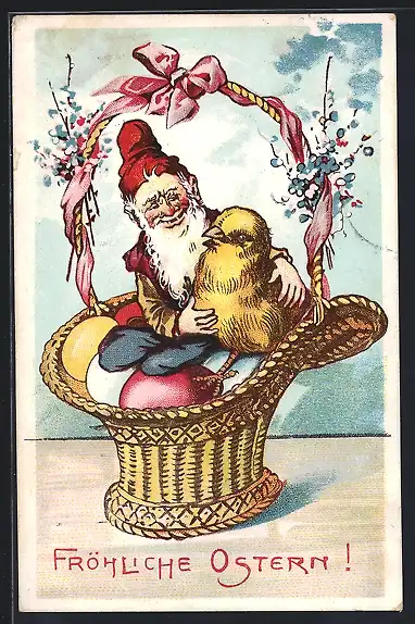 AK Zwerg mit Osterküken im Osterkorb, Ostergruss
