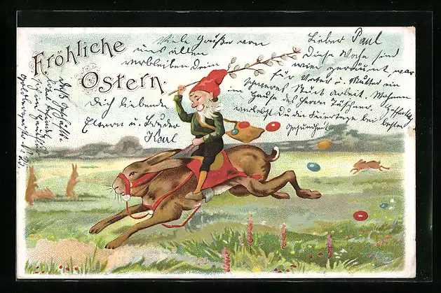 AK Zwerg reitet auf dem Osterhasen, Ostergruss