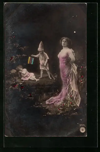 AK Zwerg, schlafendes Elfchen und Grazie im nächtlichen Garten