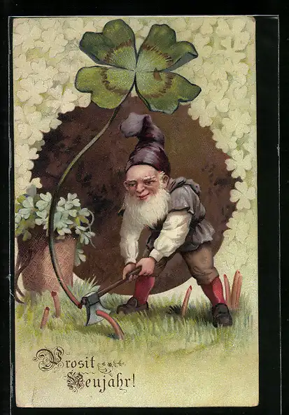 AK Zwerg schneidet ein Kleeblatt ab, Neujahr