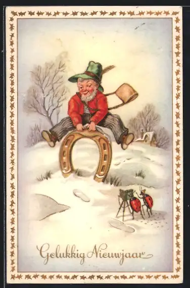 AK Zwerg springt über ein goldenes Hufeisen, Marienkäfer mit Fotoapparat
