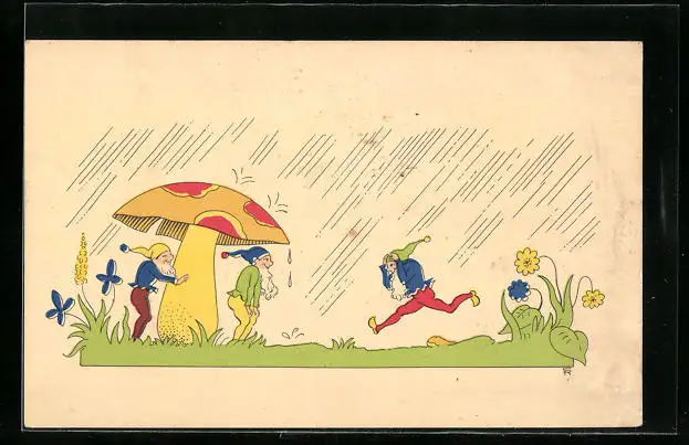 AK Zwerge im Regen und unter dem Pilz
