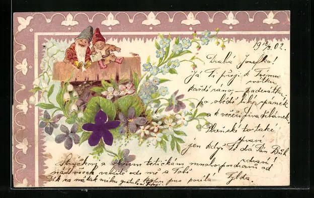 AK Zwerge im Wald mit Blumen