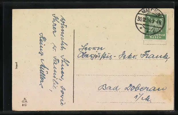 Personenbezogene Daten auf der Rückseite der Karte wurden durch blauen Textmarker unkenntlich gemacht. Die blauen Stellen sind auf die Vorderseite durchgeweicht und wirken sich negativ auf das Postkartenfoto aus