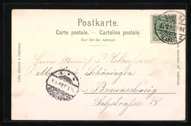 Personenbezogene Daten auf der Rückseite der Karte wurden durch blauen Textmarker unkenntlich gemacht. Die blauen Stellen sind auf die Vorderseite durchgeweicht und wirken sich negativ auf das Postkartenfoto aus