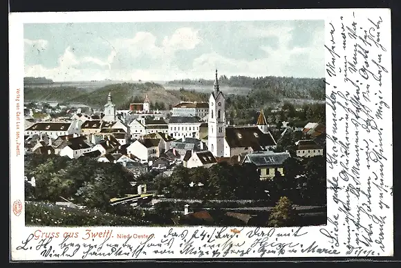 AK Zwettl, Blick zum Ort mit Kirche um 1900