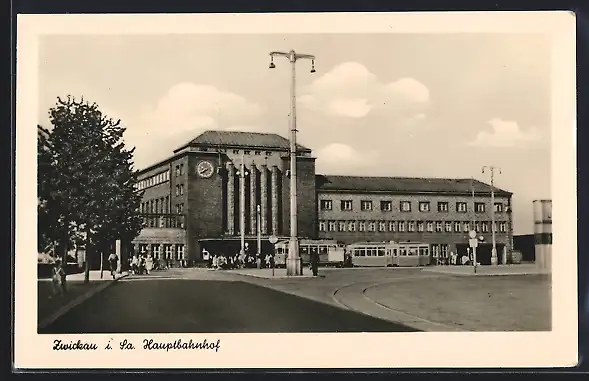 AK Zwickau, Hauptbahnhof mit Strassenbahnstation