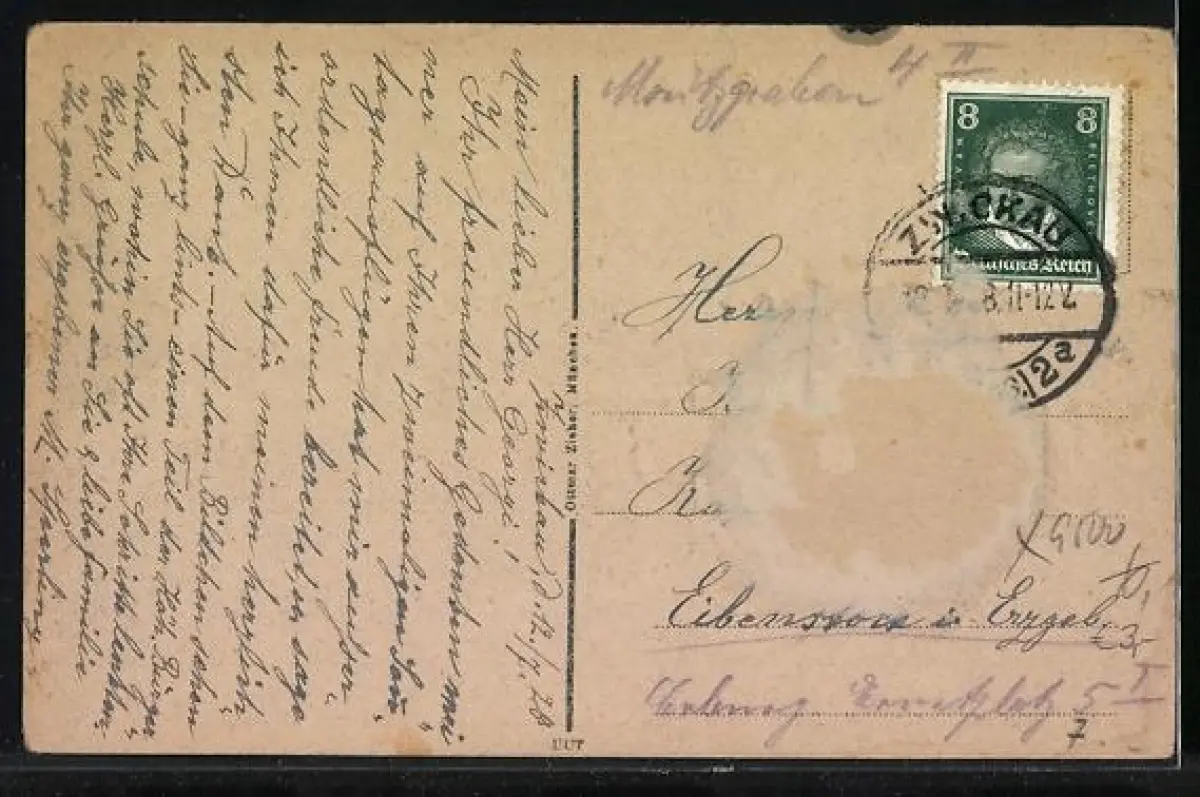 alte Ansichtskarte, gelaufen, rückseitig Oberflächenschaden, rückseitig Klebe- und Papierreste, guter Zustand