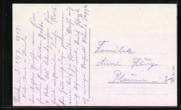 Personenbezogene Daten auf der Rückseite der Karte wurden durch blauen Textmarker unkenntlich gemacht. Die blauen Stellen sind auf die Vorderseite durchgeweicht und wirken sich negativ auf das Postkartenfoto aus