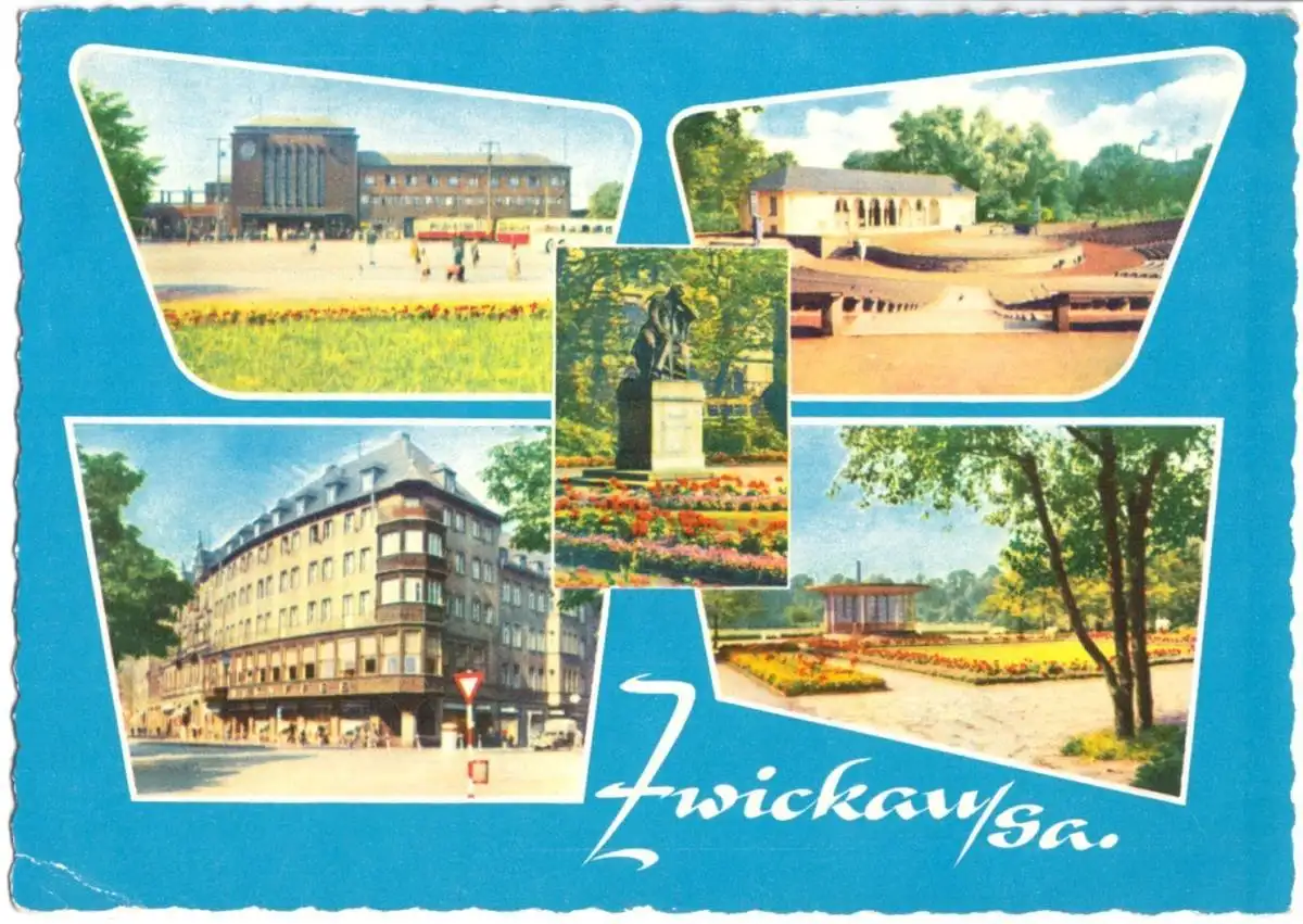 Ansichtskarte Zwickau fünf Abb., gestaltet Erhaltung II, leichte Eckbüge postalisch gelaufen, gestempelt: Zwickau, 26.4.62 Druckvermerk: 1961 Herstellungsland: DDR Verlag: Erhard Neubert KG - D333