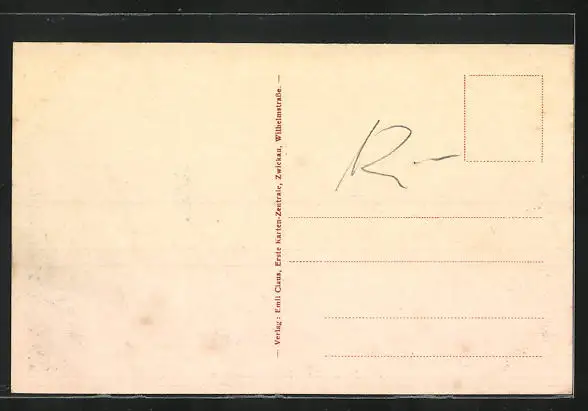 Personenbezogene Daten auf der Rückseite der Karte wurden durch blauen Textmarker unkenntlich gemacht. Die blauen Stellen sind auf die Vorderseite durchgeweicht und wirken sich negativ auf das Postkartenfoto aus