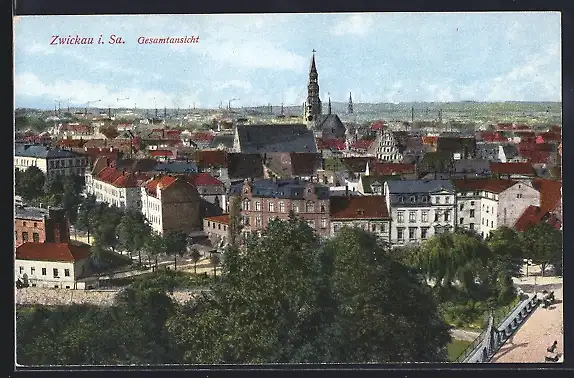 AK Zwickau i. Sa., Gesamtansicht aus der Vogelschau mit Panorama