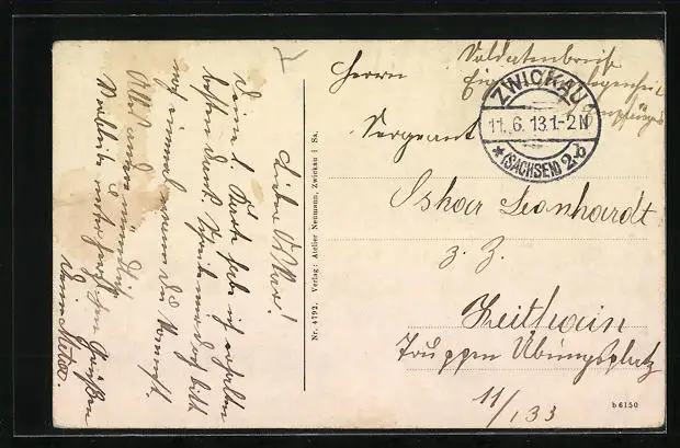 Personenbezogene Daten auf der Rückseite der Karte wurden durch blauen Textmarker unkenntlich gemacht. Die blauen Stellen sind auf die Vorderseite durchgeweicht und wirken sich negativ auf das Postkartenfoto aus