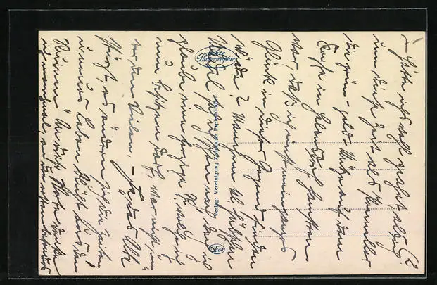 Personenbezogene Daten auf der Rückseite der Karte wurden durch blauen Textmarker unkenntlich gemacht. Die blauen Stellen sind auf die Vorderseite durchgeweicht und wirken sich negativ auf das Postkartenfoto aus