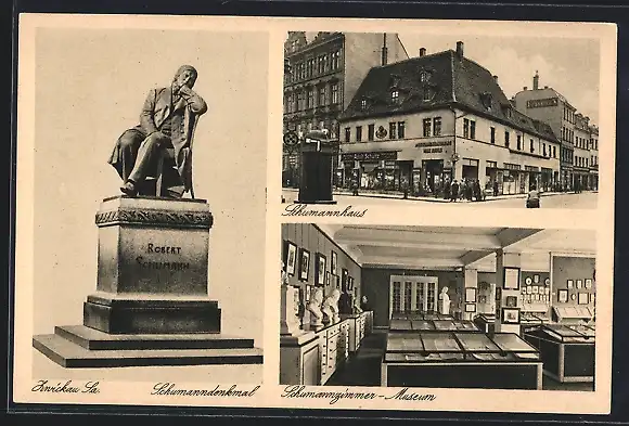 AK Zwickau i. Sa., Schumannhaus und Schumanndenkmal