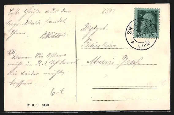 Personenbezogene Daten auf der Rückseite der Karte wurden durch blauen Textmarker unkenntlich gemacht. Die blauen Stellen sind auf die Vorderseite durchgeweicht und wirken sich negativ auf das Postkartenfoto aus