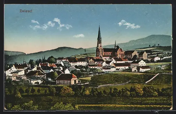 AK Zwiesel, Ortsansicht mit kirche vor blauem Himmel