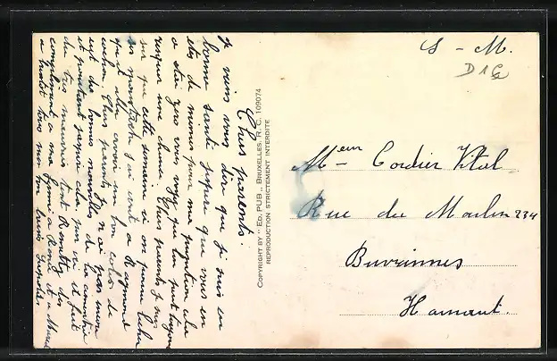 Personenbezogene Daten auf der Rückseite der Karte wurden durch blauen Textmarker unkenntlich gemacht. Die blauen Stellen sind auf die Vorderseite durchgeweicht und wirken sich negativ auf das Postkartenfoto aus
