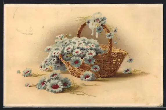 AK blaue Kornblumen in Holzkorb und davor liegend