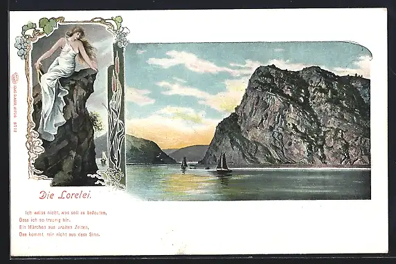 AK die Loreley sitzt auf einem Felsen, Segelboote passieren die Loreley