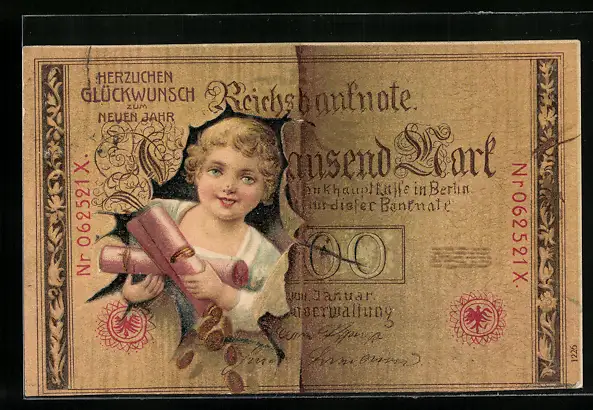 AK ein Kind mit Münzstangen schaut durch einen Tausend Mark-Schein