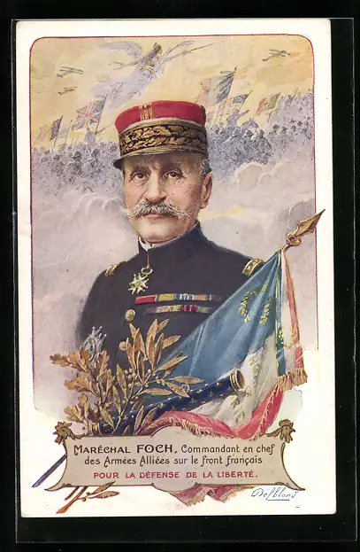 AK französischer Marschall Foch in Uniform mit Orden und Tricolore, Kommadeur der alliierten Armeen