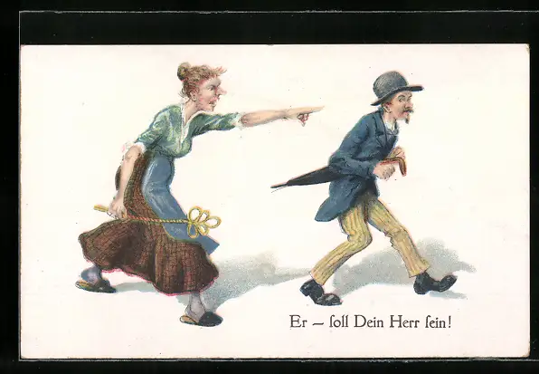 AK frauenfeindlicher Humor, Frau mit Teppichklopfer hinter dem Mann-Er soll dein Herr sein
