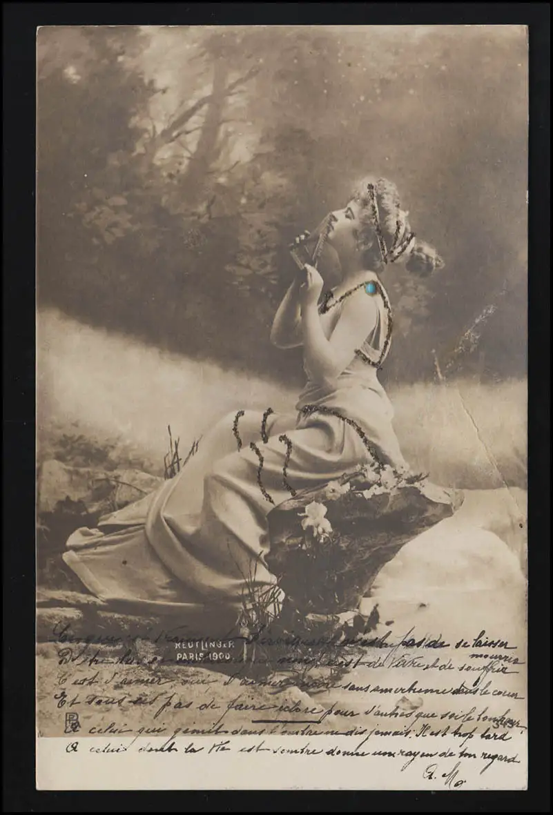 Fotograf Léopold-Émile Reutlinger Paris. Ansichtskarte verziert mit blauer Perle und Glitzersteinen.