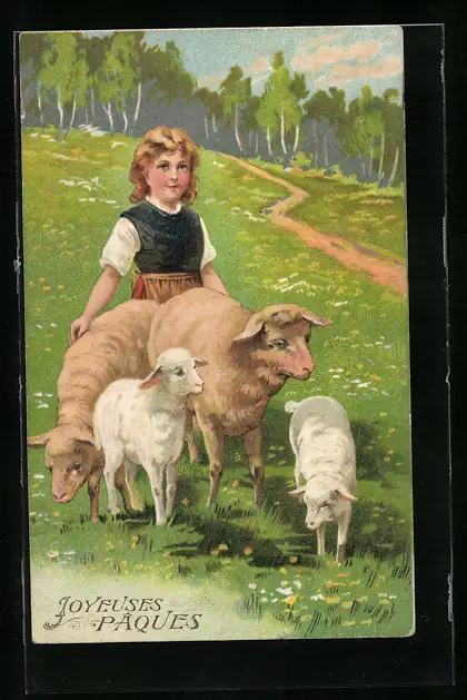 AK junge Frau mit Schafen auf der Weide, Ostern