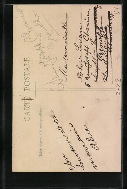 Personenbezogene Daten auf der Rückseite der Karte wurden durch blauen Textmarker unkenntlich gemacht. Die blauen Stellen sind auf die Vorderseite durchgeweicht und wirken sich negativ auf das Postkartenfoto aus