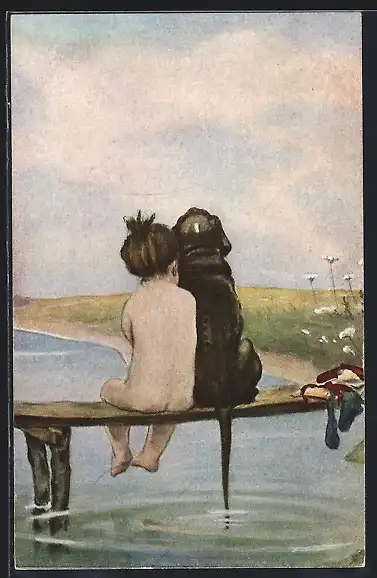 AK kleines nacktes Mädchen sitzt Seite an Seite mit ihrem Hund auf einem Steg