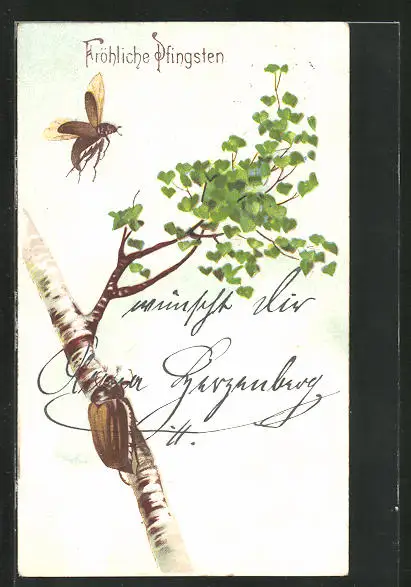 AK krabbelnder und fliegende Maikäfer auf einer Birke