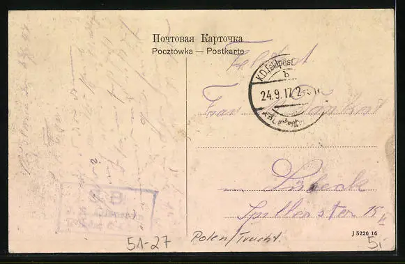 gelaufen 1917, Briefmarke entfernt, guter Zustand
