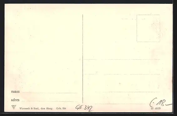 Personenbezogene Daten auf der Rückseite der Karte wurden durch blauen Textmarker unkenntlich gemacht. Die blauen Stellen sind auf die Vorderseite durchgeweicht und wirken sich negativ auf das Postkartenfoto aus