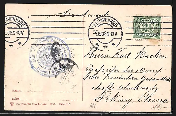 gelaufen 1908, Eckknick unten re., guter Zustand