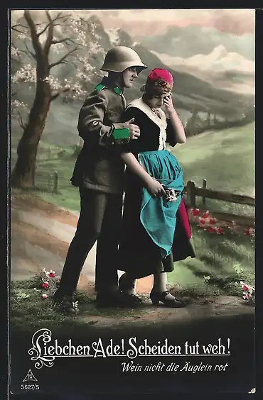 AK schweizer Soldat in Uniform mit Stahlhelm nimmt Abschied von seiner Liebsten