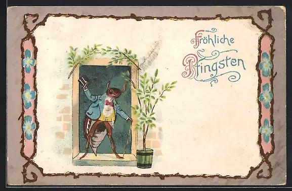 AK vermenschlichter Maikäfer mit Zylinder, Fliege und Gehstock